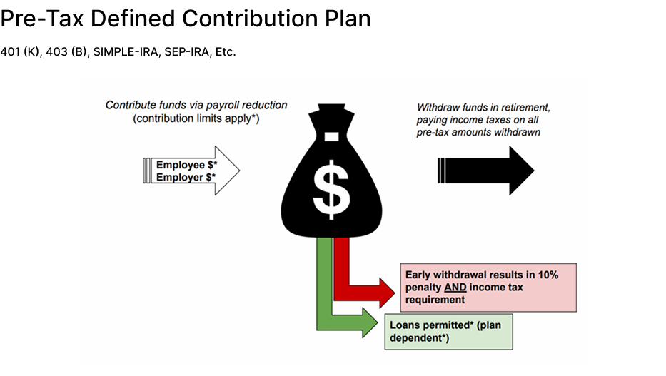 Employer-sponsored Retirement plans: These plans are the most commonly available to US employees by and large. Defined contribution plans are predominantly Pre-tax/Traditional (monies taxed when withdrawn, ideally in retirement) or After-tax/Roth (monies taxed now, growing tax-free for your lifetime) and allow for employees to contribute a maximum of $24,500 (2026) each year, along with the employer being able (though may not be required) to contribute a percentage of an employee's salary into the account.