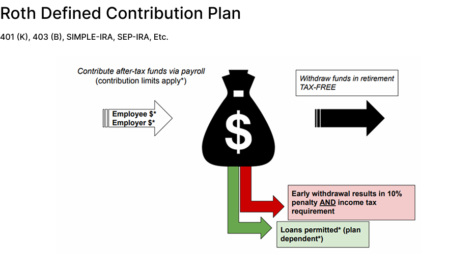 Employer-sponsored Retirement plans: These plans are the most commonly available to US employees by and large. Defined contribution plans are predominantly Pre-tax/Traditional (monies taxed when withdrawn, ideally in retirement) or After-tax/Roth (monies taxed now, growing tax-free for your lifetime) and allow for employees to contribute a maximum of $24,500 (2026) each year, along with the employer being able (though may not be required) to contribute a percentage of an employee's salary into the account.